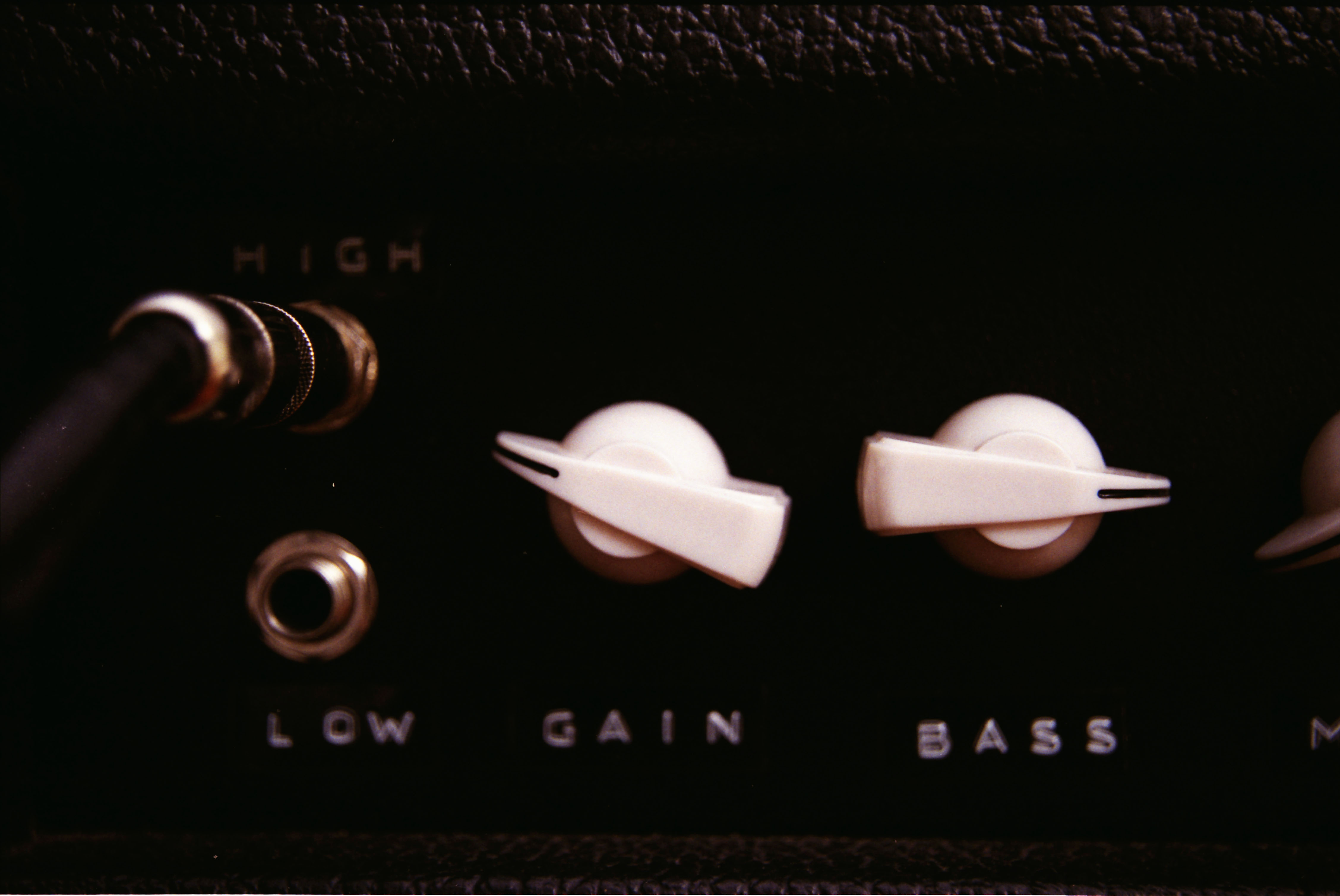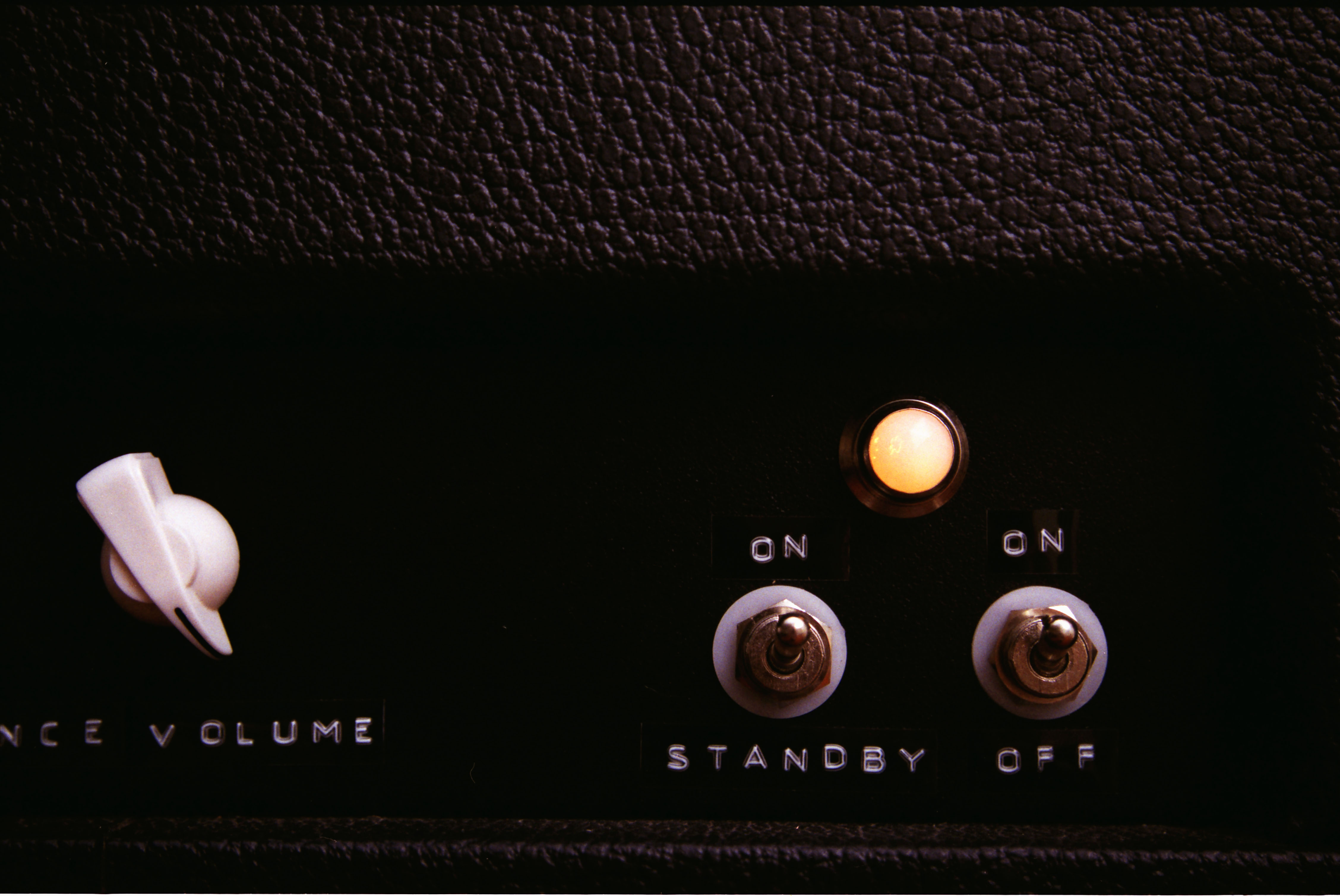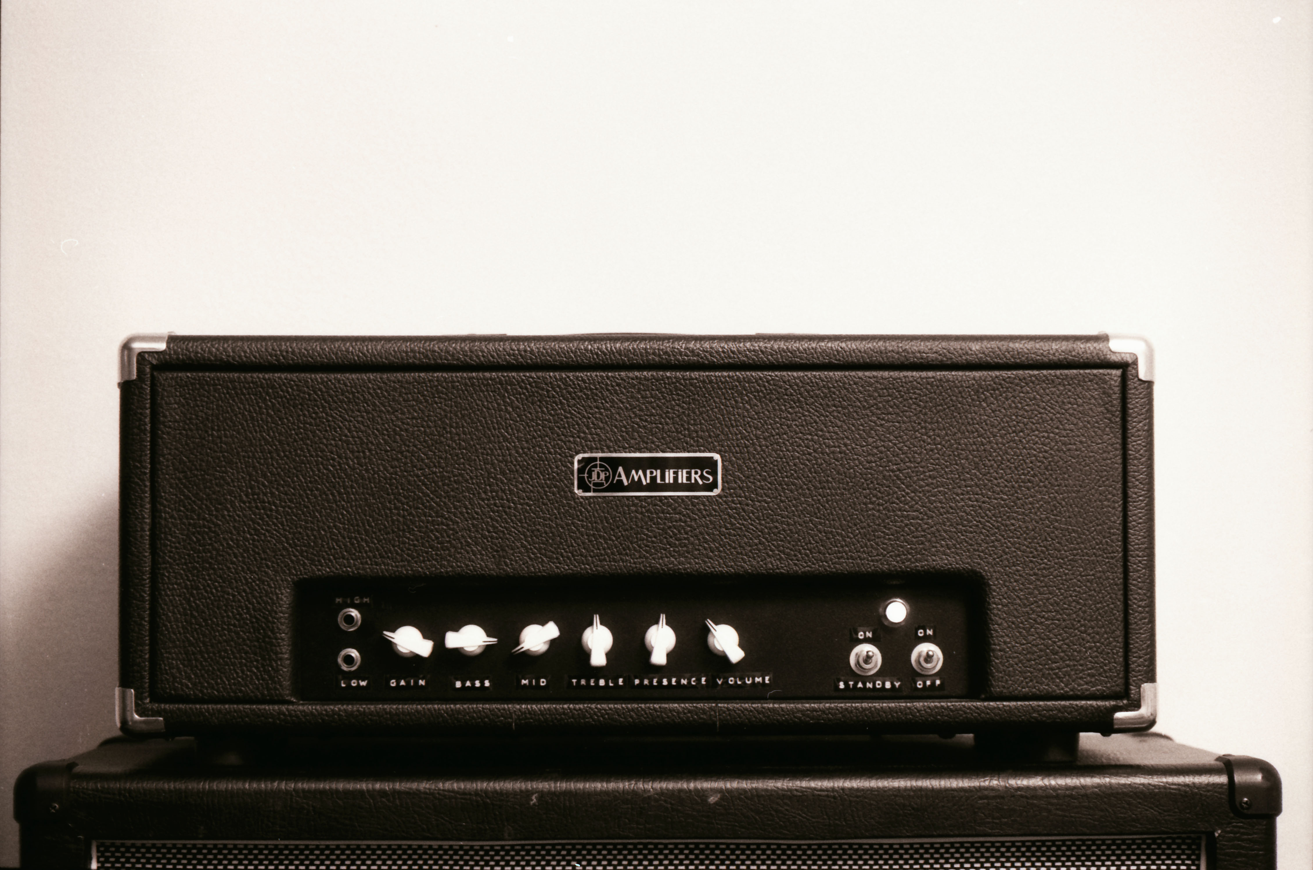 The Front controls (from left to right): High gain input (top), Low gain input (bottom), Gain, Bass, Mid, Treble,Presence, Volume, Standby, Power.
