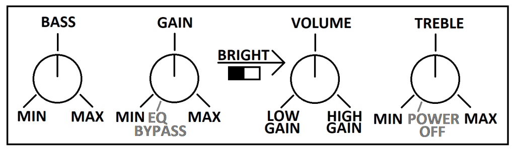 The leftmost knob is the bass knob. The next one over is the gain knob. At minimum, the pre-amp is very clean. Turn it all the way over to max for 35 dB of pre-amp boost! When turned down passed minimum, the EQ is bypassed for a very raw straightforward tone. It’s just you and your guitar. It’s as close as plugging straight into the speaker as you can get! With the EQ bypassed, you can get some great power tube overdrive by cranking the volume towards Low Gain. The switch in the middle is the bright switch, enabled when pushed to the right. This switch works with the volume control to provide a boost to the treble at lower volumes. It works even with the EQ bypassed. The volume knob is unlike any other amplifier you may have used. When pointed straight up, the amplifier is muted. Rotate it towards Low Gain, and you increase the volume of the low gain channel. Rotate it towards High Gain and you increase the volume of the high gain channel. This works no matter what the gain control is set to. Putting the gain on EQ Bypass and rotating the volume towards High Gain gives you a raw pre-amp sound with a mild overdrive. The bright switch is tied to the low gain side of this knob. When on the low gain side of the knob, it works like any other bright switch you may have used in the past. However, when you are on the high gain side of the knob, it adds in treble from the low gain channel! The result is a dynamic and clean high end, with a sustaining distorted low end. It’s a very sweet tone, and unlike anything you may have heard before! The rightmost knob is the treble control. When turned down passed minimum, the amplifier turns off.