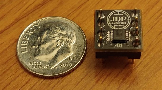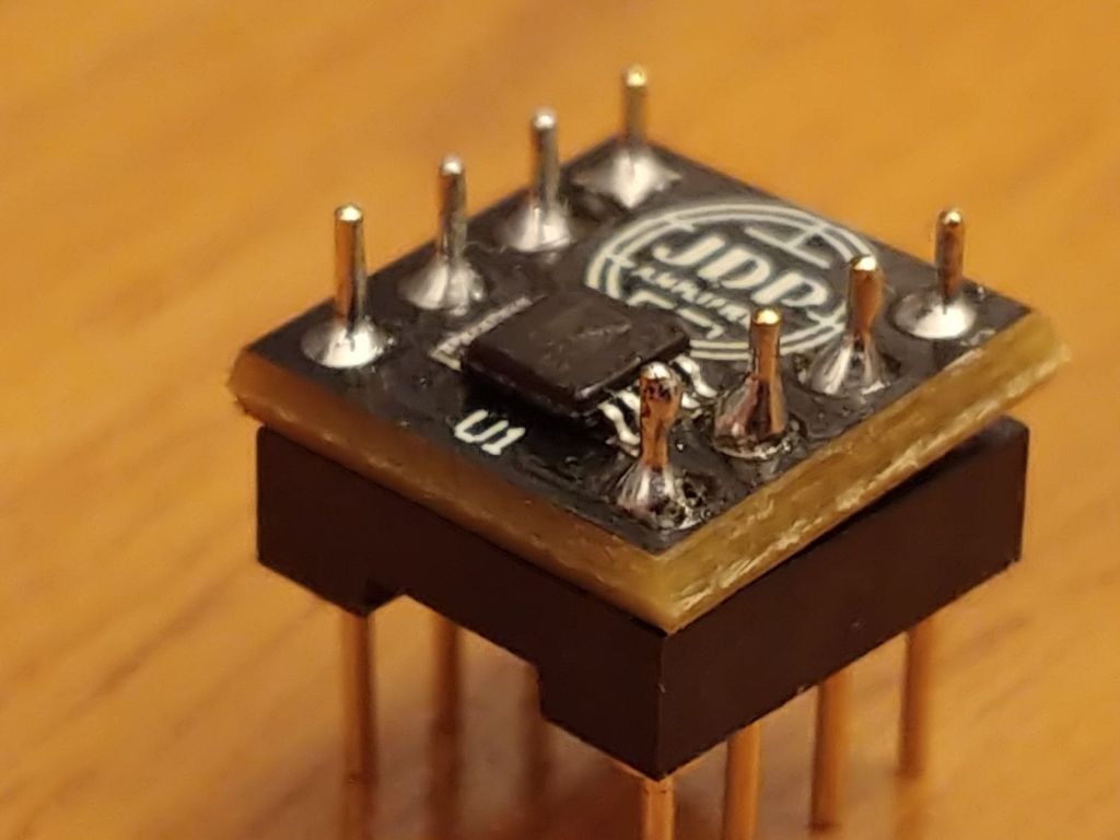 Rather than waiting for another solution to appear, and not satisfied with scrapping another otherwise good amplifier, I decided to make my own replacement solution. I found a modern part that would do the task. With the magic of miniaturization, the new IC is so small that it can fit within the space of the original IC! In order to make this as future resistant as possible, I designed the PCB to accommodate two different package styles of the same new IC. Not only that, I included space to put an entirely different modern IC on the other side of the board (not visible). This too has two different package styles. In all, there are now 4 modern ICs that will fill the role of this long unobtanium IC. I call it the TL604JDP.